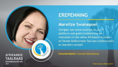 Dit was 'n groot verrassing toe Ria Olivier, van die Afrikaanse Taalraad, my gekontak het met goeie nuus. Ek het 'n nominasie ontvang om 'n erepenning (Kokertoekenning) by die Afrikaanse Taalraad te ontvang vir die werk wat ek in en vir Afrikaans doen. Ek het 17 November 2017 die voorreg gehad om Kuilsrivier toe te vlieg om die Afrikaanse Taalraad Kokerfunksie by te woon.